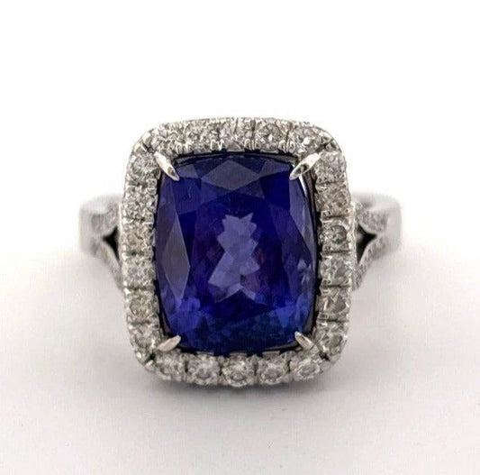 Elongated Cushion Natural Tanzanite & Round Diamond 6.29CT 14K White Gold Ring Size 8