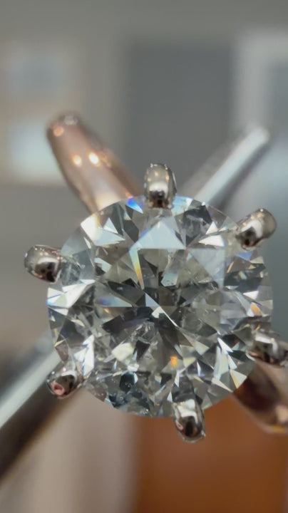 Offered is one (1) lady’s solitaire engagement ring containing one (1) natural round brilliant cut diamond set in a six-prong white gold Tiffany-style head on a solid 14-karat rose gold shank.