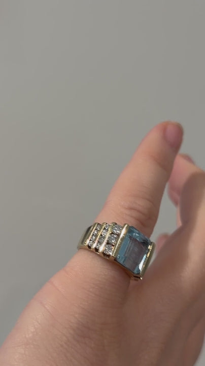 14K Yellow Gold Emerald Cut Aquamarine & Diamond Ring – 7.75g – Size 4.75