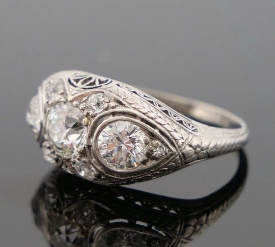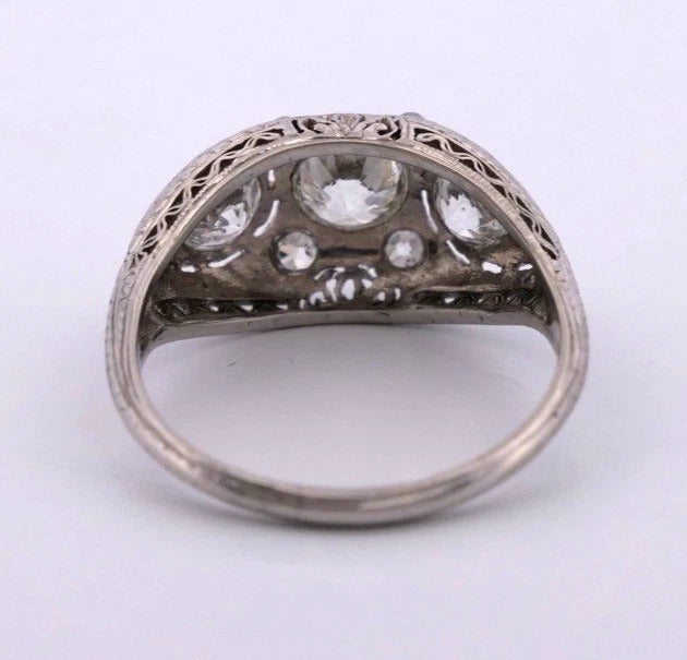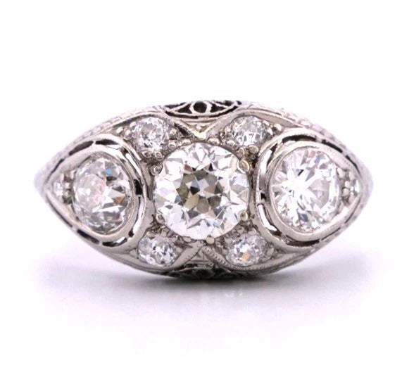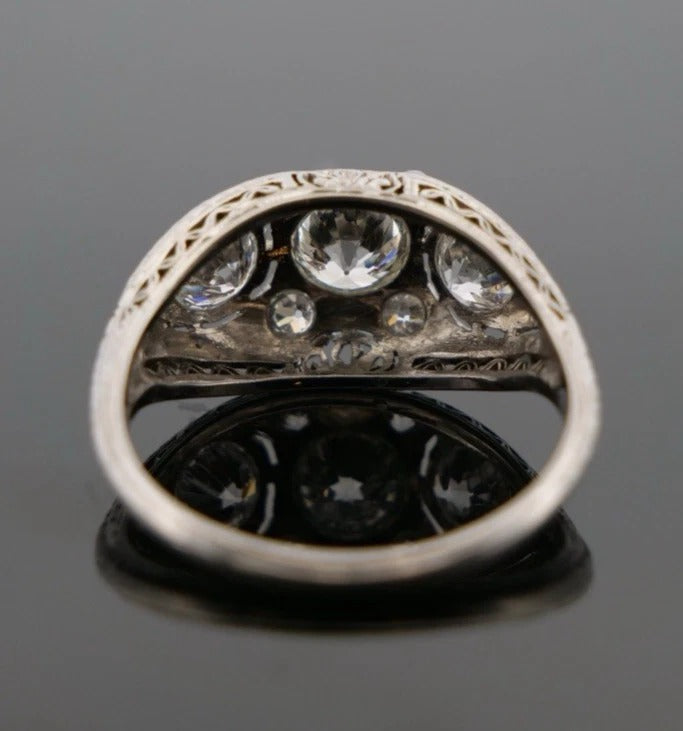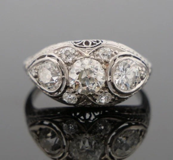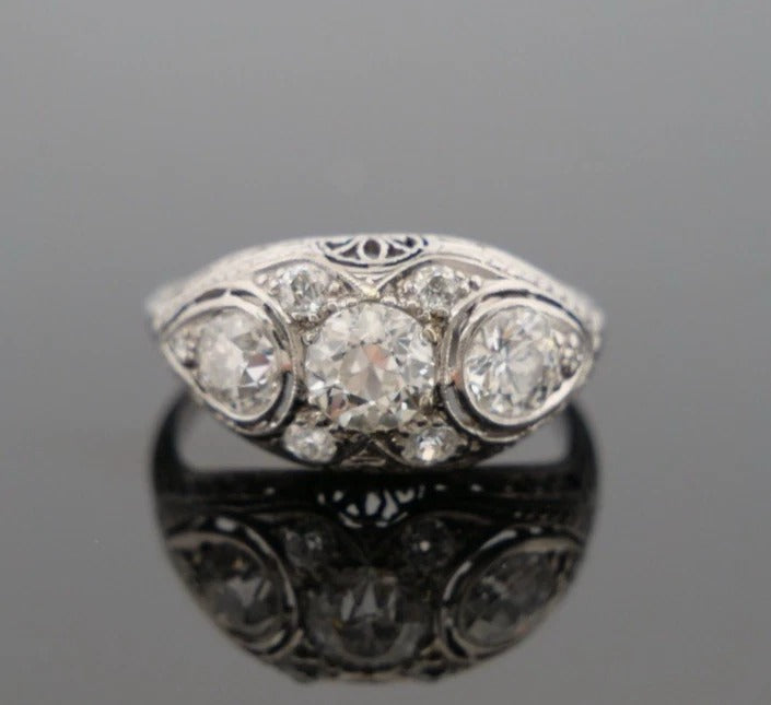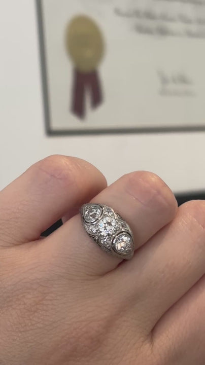 This is a stunning original Art Deco era dome ring, handcrafted in solid platinum and set with old European cut diamonds in a classic 1920s design. The ring features a high-quality center stone flanked by two additional old European cuts and four accent diamonds, all set in an ornate pierced filigree gallery with floral-style shoulders and a grooved, polished shank.