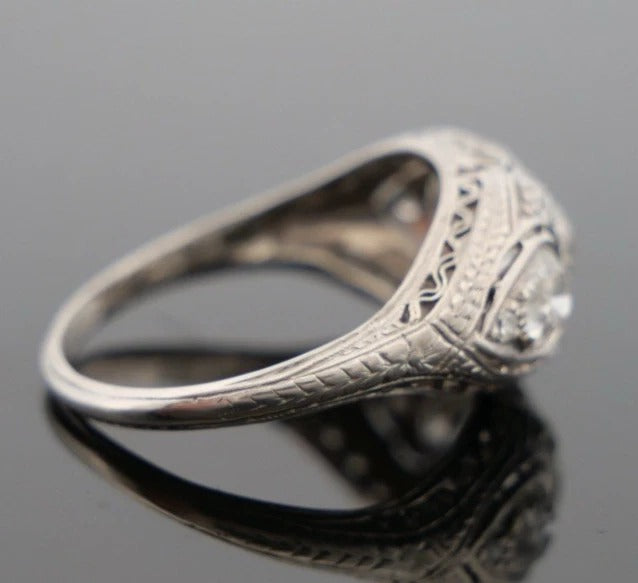 Design: Cutout filigree with floral shoulders, grooved shank, and open gallery