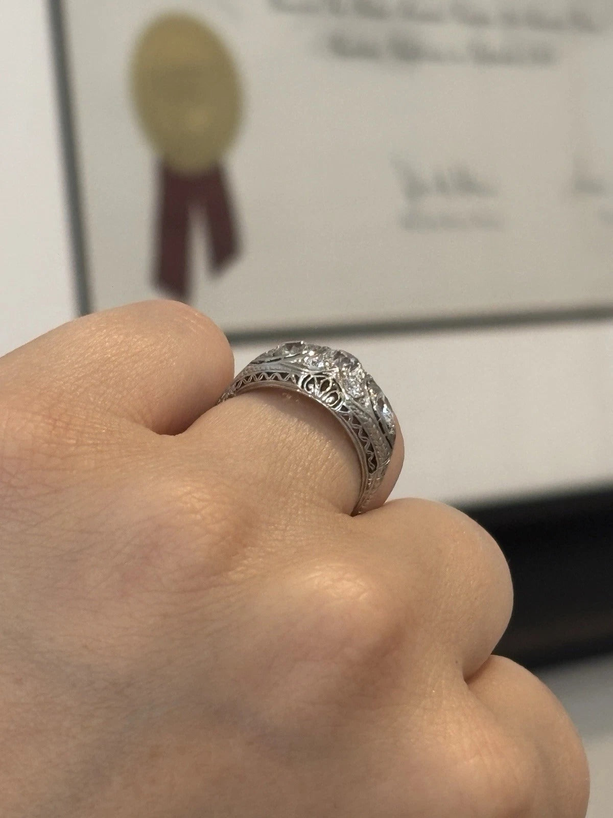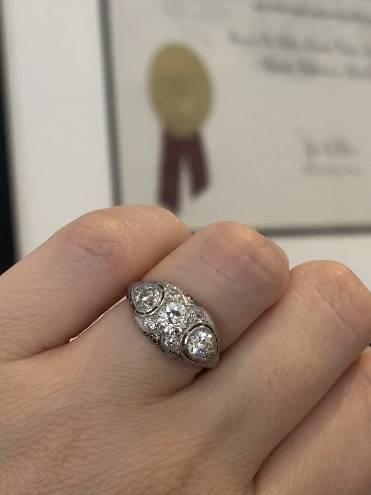 This heirloom-quality engagement or cocktail ring blends the romantic geometry of the Art Deco era with exceptional diamond quality and craftsmanship. With natural old European cuts, detailed filigree, and hand-built platinum construction, it’s a true collector’s piece and a wearable piece of history.