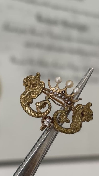 This striking antique brooch is crafted in solid 18-karat yellow gold and features two intricately detailed dragons flanking a royal crown adorned with natural seed pearls and a bezel-set diamond. A hidden enhancer loop behind the diamond allows it to be worn as a pendant or enjoyed on its own as a brooch. The piece is stamped “14K” and tests as 18K gold. It remains in original condition with no modifications, aside from two missing seed pearls in the crown.