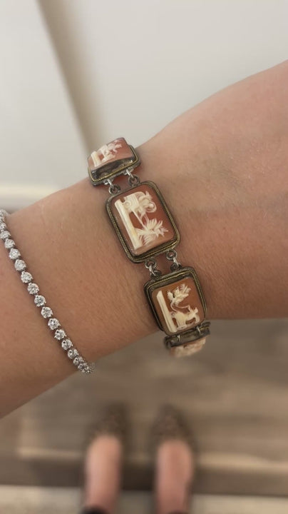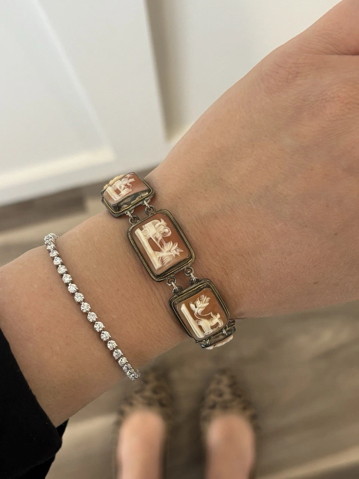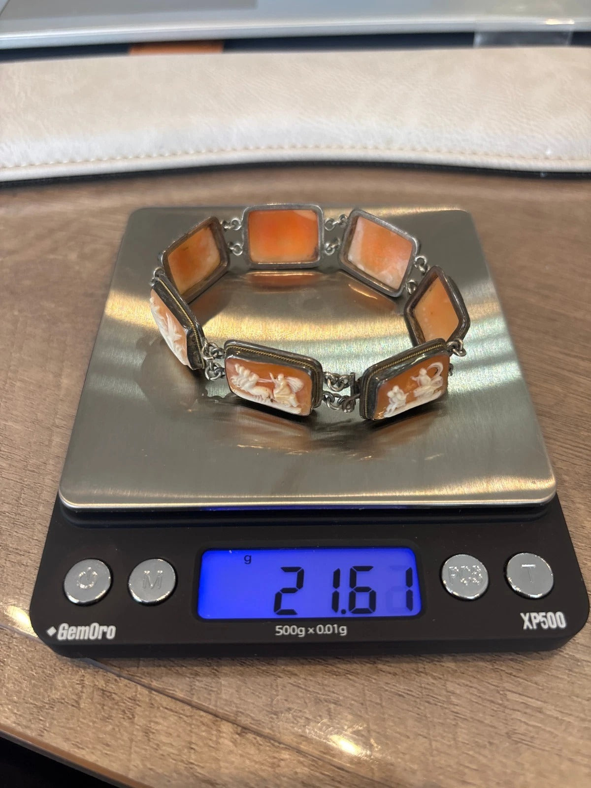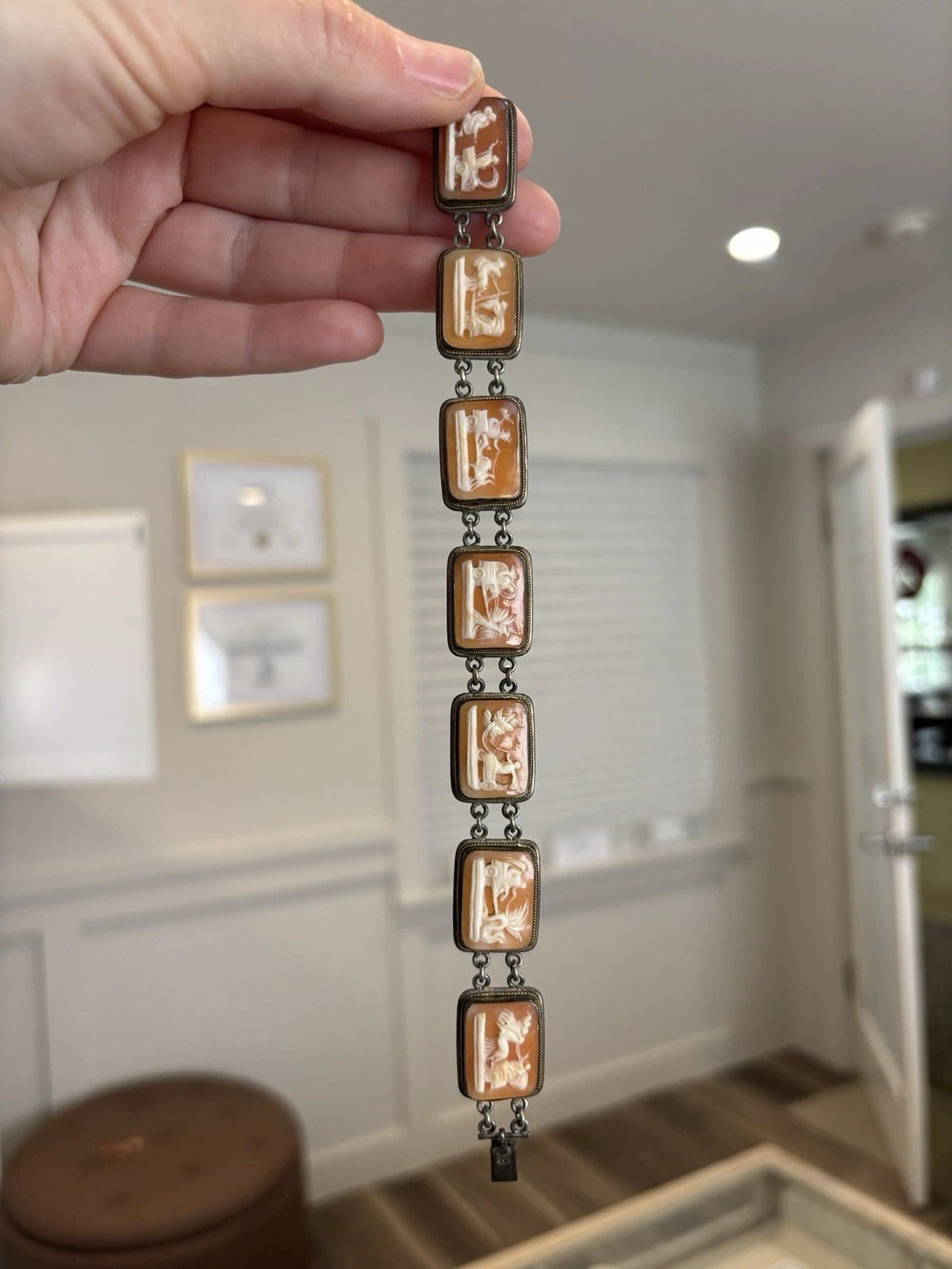 This antique panel bracelet features seven intricately hand-carved shell cameos depicting classical scenes, each bezel-set in silver. The bracelet is crafted in 800 silver (stamped on the clasp), with a tongue and small box clasp for secure wear. The bracelet measures approximately 7.5 inches in length and 1.5 cm wide. Total weight is 21.61 grams.