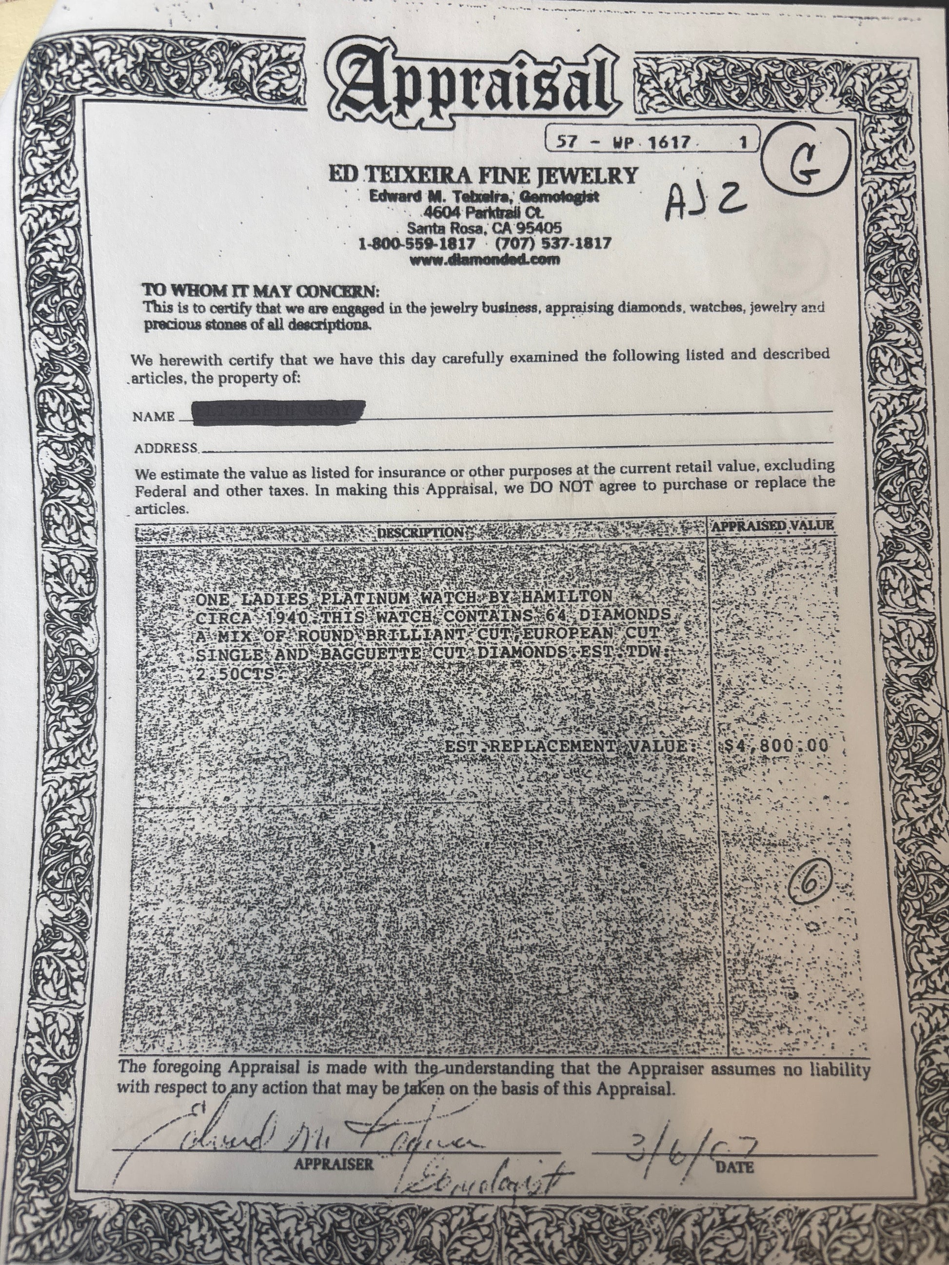 - Metal: Platinum case (stamped and tested), rolled gold plate bracelet (white gold tone)