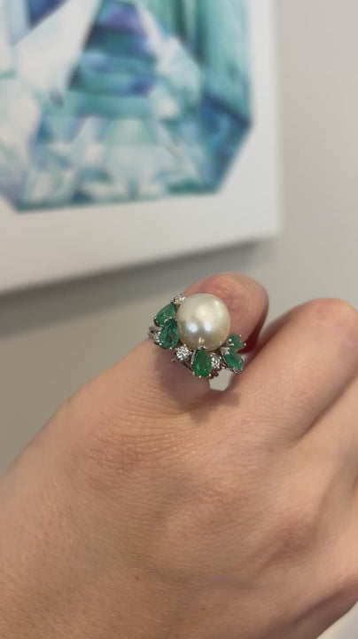Vintage 14K White Gold South Sea Pearl, Emerald & Diamond Cocktail Ring