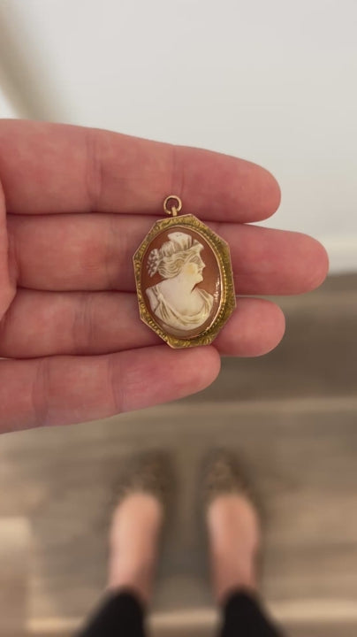 This vintage hand-carved shell cameo brooch features a classical female bust in profile, framed in solid 10-karat yellow gold with an octagonal edge design. The mounting is stamped and acid-tested 10K and includes both a pin and hidden bail, making it wearable as either a brooch or a pendant. The piece weighs 5.08 grams and measures approximately 3 cm tall by 2.5 cm wide.